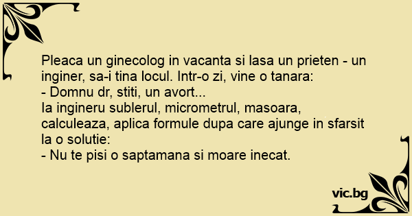 Pleaca un ginecolog in vacanta si lasa un prieten - un inginer, sa-i tina locul. Intr-o zi, vine o tanara: