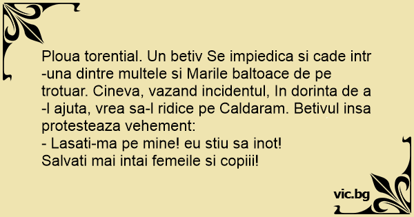 Ploua torential. Un betiv Se impiedica si cade intr-una dintre multele si Marile baltoace de pe trotuar. Cineva, vazand incidentul, In dorinta de a-l ajuta, vrea sa-l ridice pe Caldaram. Betivul insa protesteaza vehement: