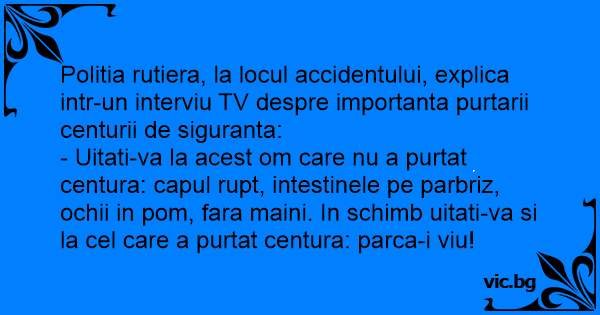 - Uitati-va la acest om care nu a purtat centura: capul rupt, intestinele pe parbriz, ochii in pom, fara maini. In schimb uitati-va si la cel care a purtat centura: parca-i viu!