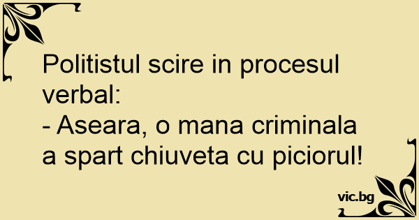 Politistul scire in procesul verbal:<br />- Aseara, o mana criminala a spart chiuveta cu piciorul!