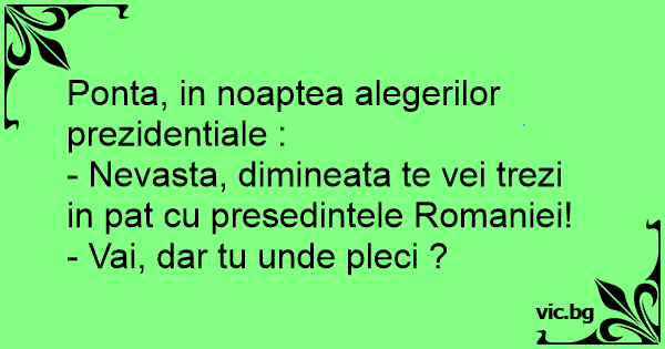Ponta, in noaptea alegerilor prezidentiale :<br />- Nevasta, dimineata te vei trezi in pat cu presedintele Romaniei!<br />- Vai, dar tu unde pleci ?