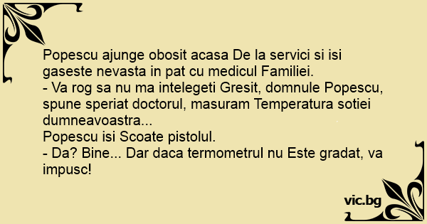 - Va rog sa nu ma intelegeti Gresit, domnule Popescu, spune speriat doctorul, masuram Temperatura sotiei dumneavoastra...