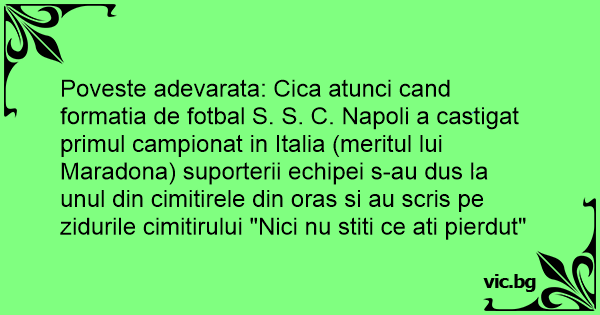 Poveste adevarata: Cica atunci cand formatia de fotbal S. S. C. Napoli a castigat primul campionat in Italia (meritul lui Maradona) suporterii echipei s-au dus la unul din cimitirele din oras si au scris pe zidurile cimitirului "Nici nu stiti ce ati pierdut"