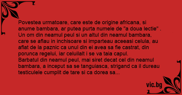 Povestea urmatoare, care este de origine africana, si anume bambara, ar putea purta numele de "a doua lectie" .