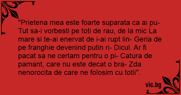 "Prietena mea este foarte suparata ca ai pu- Тuт sa-i vorbesti pe toti de rau, de la mic La mare si te-ai enervat de i-ai rupt lin- Geria de pe franghie devenind putin ri- Dicul. Ar fi pacat sa ne certam pentru o pi- Catura de pamant, care nu este decat o вrа- Zda nenorocita de care ne folosim cu totii".