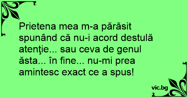 Prietena mea m-a părăsit spunând că nu-i acord destulă atenţie... sau ceva de genul ăsta... în fine... nu-mi prea amintesc exact ce a spus!