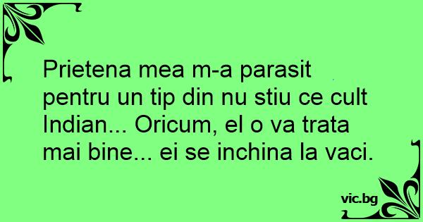 Prietena mea m-a parasit pentru un tip din nu stiu ce cult Indian... Oricum, el o va trata mai bine... ei se inchina la vaci.