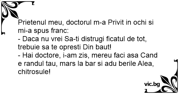 - Hai doctore, i-am zis, mereu faci asa Cand e randul tau, mars la bar si adu berile Alea, chitrosule!