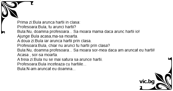 Bula:Nu, doamna profesoara... Sa moara sor-mea daca am aruncat eu hartii!