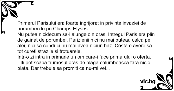 Nu putea nicidecum sa-i alunge din oras. Intregul Paris era plin de gainat de porumbei. Parizienii nici nu mai puteau calca pe alei, nici sa conduci nu mai avea niciun haz. Costa o avere sa tot cureti strazile si trotuarele.