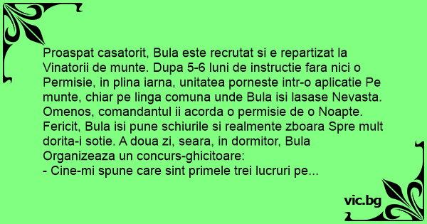 Proaspat casatorit, Bula este recrutat si e repartizat la Vinatorii de munte. Dupa 5-6 luni de instructie fara nici o Permisie, in plina iarna, unitatea porneste intr-o aplicatie Pe munte, chiar pe linga comuna unde Bula isi lasase Nevasta. Omenos, comandantul ii acorda o permisie de o Noapte. Fericit, Bula isi pune schiurile si realmente zboara Spre mult dorita-i sotie. A doua zi, seara, in dormitor, Bula Organizeaza un concurs-ghicitoare: