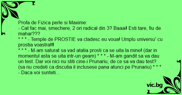 * * * - M-am saturat sa vad atatia prosti ca se uita la mine! (dar in momentul asta se uita intr-un geam) * * * - M-am gandit sa va dau un test. Dar voi nici nu stiti cine-i Prunariu, de ce sa va dau test? (sa nu credeti ca discutia il inclusese pana atunci pe Prunariu) * * * - Daca voi sunteti mari genii si eu sunt asa o proasta, va rog sa-mi scuzati!