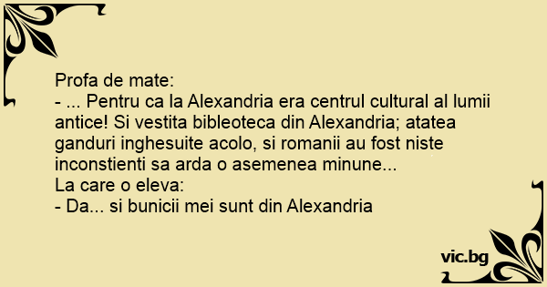 Profa de mate: - ... Pentru ca la Alexandria era centrul cultural al lumii antice! Si vestita bibleoteca din Alexandria; atatea ganduri inghesuite acolo, si romanii au fost niste inconstienti sa arda o asemenea minune... La care o eleva: - Da... si bunicii mei sunt din Alexandria