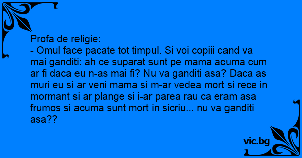 - Omul face pacate tot timpul. Si voi copiii cand va mai ganditi: ah ce suparat sunt pe mama acuma сuм ar fi daca eu n-as mai fi? Nu va ganditi asa? Daca as muri eu si ar veni mama si m-ar vedea mort si rece in mormant si ar plange si i-ar parea rau ca eram asa frumos si acuma sunt mort in sicriu... nu va ganditi asa??