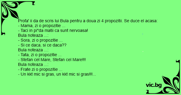 Profa' ii da de scris lui Bula pentru a doua zi 4 propozitii. Se duce el acasa: