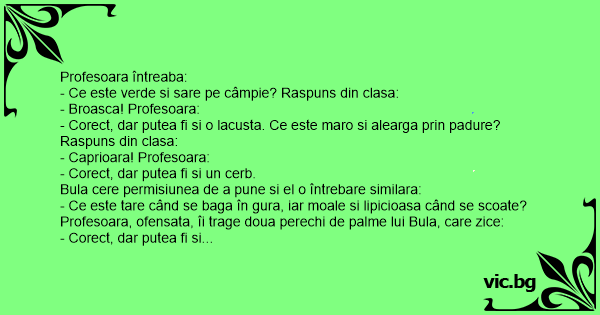 - Ce este verde si sare pe câmpie? Raspuns din clasa: