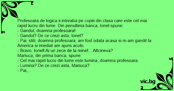 Profesoara de logica ii intreaba pe copiii din clasa care este cel mai rapid lucru din lume. Din penultima banca, Ionel spune:
