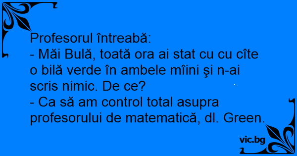 - Măi Bulă, toată ora ai stat cu cu cîte o bilă verde în ambele mîini şi n-ai scris nimic. De ce?