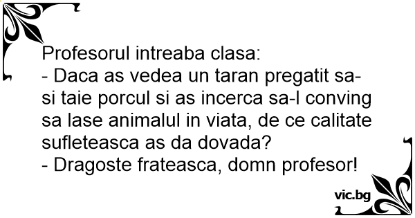 - Daca as vedea un taran pregatit sa-si taie porcul si as incerca sa-l conving sa lase animalul in viata, de ce calitate sufleteasca as da dovada?