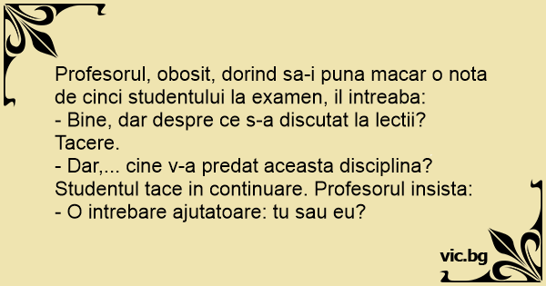 Profesorul, obosit, dorind sa-i puna macar o nota de cinci studentului la examen, il intreaba: