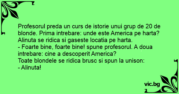 Profesorul preda un curs de istorie unui grup de 20 de blonde. Prima intrebare: unde este America pe harta?