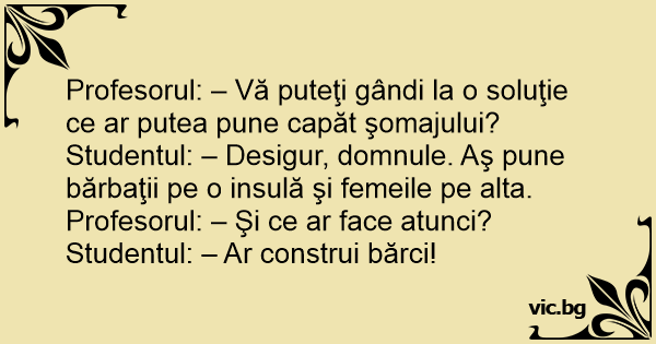 Studentul: – Desigur, domnule. Aş pune bărbaţii pe o insulă şi femeile pe alta.