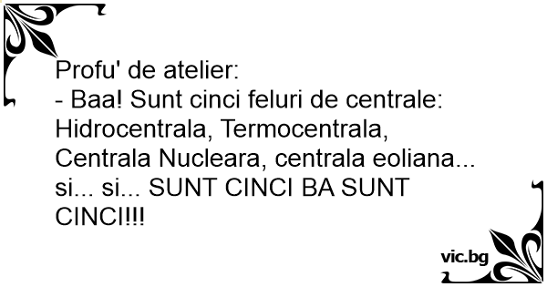 - Baa! Sunt cinci feluri de centrale: Hidrocentrala, Termocentrala, Centrala Nucleara, centrala eoliana... si... si... SUNT CINCI BA SUNT CINCI!!!