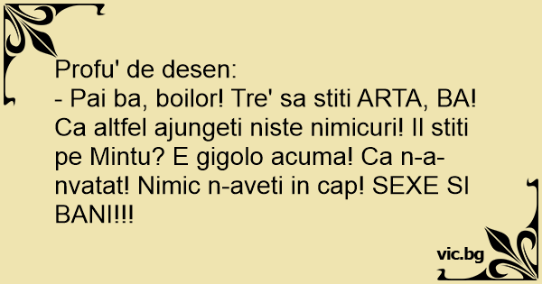 - Pai ba, boilor! Tre' sa stiti ARTA, BA! Ca altfel ajungeti niste nimicuri! Il stiti pe Mintu? E gigоlо acuma! Ca n-a-nvatat! Nimic n-aveti in cap! SEXE SI BANI!!!
