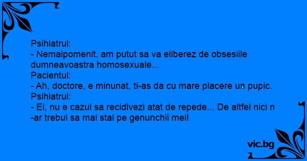 - Nemaipomenit, am putut sa va eliberez de obsesiile dumneavoastra homosexuale...