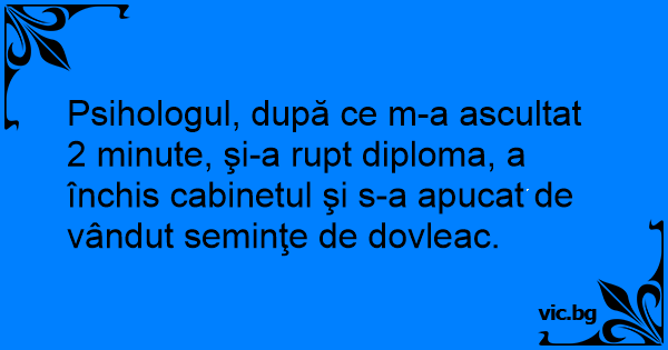 Psihologul, după ce m-a ascultat 2 minute, şi-a rupt diploma, a închis cabinetul şi s-a apucat de vândut seminţe de dovleac.