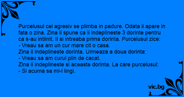 Purcelusul cel agresiv se plimba in padure. Odata ii apare in fata o zina. Zina ii spune ca ii indeplineste 3 dorinte pentru ca s-au intilnit. Il si intreaba prima dorinta. Purcelusul zice: