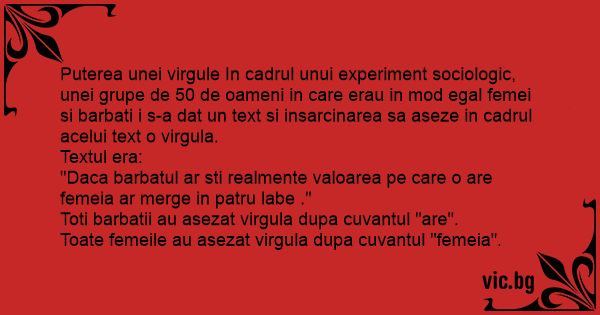 Puterea unei virgule In cadrul unui experiment sociologic, unei grupe de 50 de oameni in care erau in mod egal femei si barbati i s-a dat un text si insarcinarea sa aseze in cadrul acelui text o virgula.