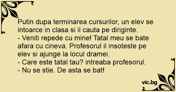 - Veniti repede cu mine! Tatal meu se bate afara cu cineva. Profesorul il insoteste pe elev si ajunge la locul dramei.