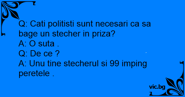 Q: Cati politisti sunt necesari ca sa bage un stecher in priza? A: O suta . Q: De ce ? A: Unu tine stecherul si 99 imping peretele .