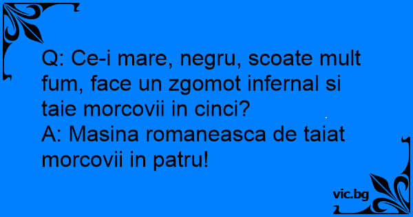 Q: Ce-i mare, negru, scoate mult fum, face un zgomot infernal si taie morcovii in cinci?