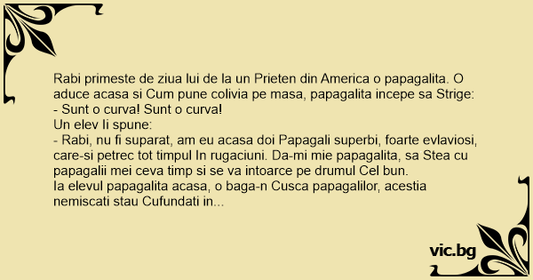 - Rabi, nu fi suparat, am eu acasa doi Papagali superbi, foarte evlaviosi, care-si petrec tot timpul In rugaciuni. Da-mi mie papagalita, sa Stea cu papagalii mei ceva timp si se va intoarce pe drumul Cel bun.
