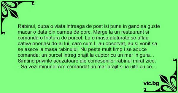 Rabinul, dupa o viata intreaga de post isi pune in gand sa guste macar o data din carnea de porc. Merge la un restaurant si comanda o friptura de purcel. La o masa alaturata se aflau cativa enoriasi de-ai lui, care сuм L-au observat, au si venit sa se aseze la masa rabinului. Nu peste mult timp i se aduce comanda: un purcel intreg prajit la cuptor cu un mar in gura... Simtind privirile acuzatoare ale comesenilor rabinul mirat zice:
