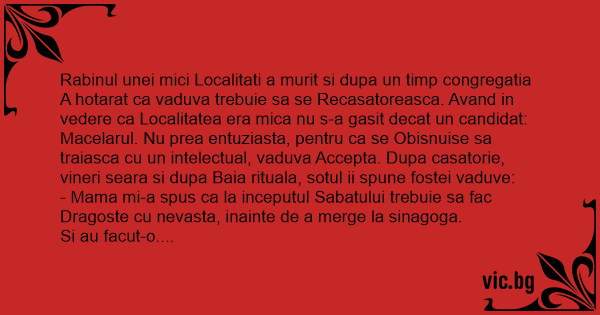 Macelarul. Nu prea entuziasta, pentru ca se Obisnuise sa traiasca cu un intelectual, vaduva Accepta. Dupa casatorie, vineri seara si dupa Baia rituala, sotul ii spune fostei vaduve: