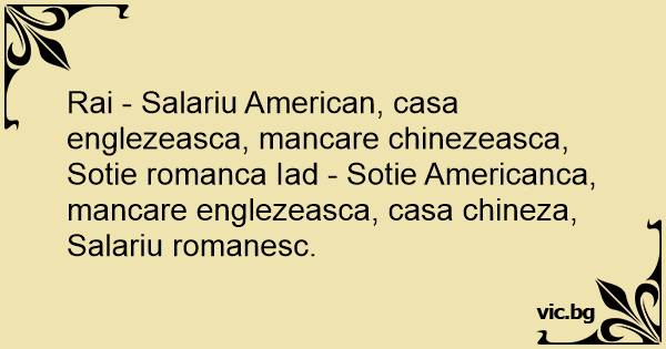 Rai - Salariu American, casa englezeasca, mancare chinezeasca, Sotie romanca Iad - Sotie Americanca, mancare englezeasca, casa chineza, Salariu romanesc.