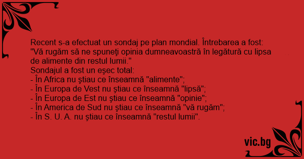 Recent s-a efectuat un sondaj pe plan mondial. Întrebarea a fost: