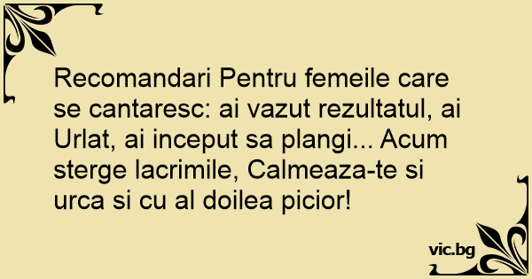 Recomandari Pentru femeile care se cantaresc: ai vazut rezultatul, ai Urlat, ai inceput sa plangi... Acum sterge lacrimile, Calmeaza-te si urca si cu al doilea picior!