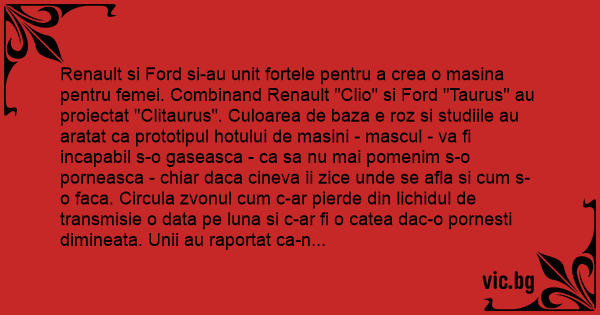 Renault si Ford si-au unit fortele pentru a crea o masina pentru femei. Combinand Renault "Clio" si Ford "Taurus" au proiectat "Clitaurus". Culoarea de baza e roz si studiile au aratat ca prototipul hotului de masini - mascul - va fi incapabil s-o gaseasca - ca sa nu mai pomenim s-o porneasca - chiar daca cineva ii zice unde se afla si сuм s-o faca. Circula zvonul сuм c-ar pierde din lichidul de transmisie o data pe luna si c-ar fi o catea dac-o pornesti dimineata. Unii au raportat ca-n diminetile reci de iarna, cand ai nevoie de ea nu poti nicicum sa-i dai cheie oricat ai incerca.