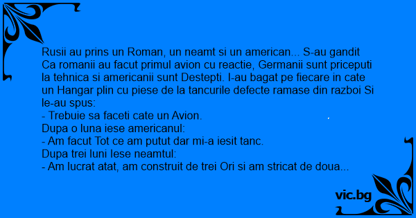 Rusii au prins un Roman, un neamt si un american... S-au gandit Ca romanii au facut primul avion cu reactie, Germanii sunt priceputi la tehnica si americanii sunt Destepti. I-au bagat pe fiecare in cate un Hangar plin cu piese de la tancurile defecte ramase din razboi Si le-au spus: