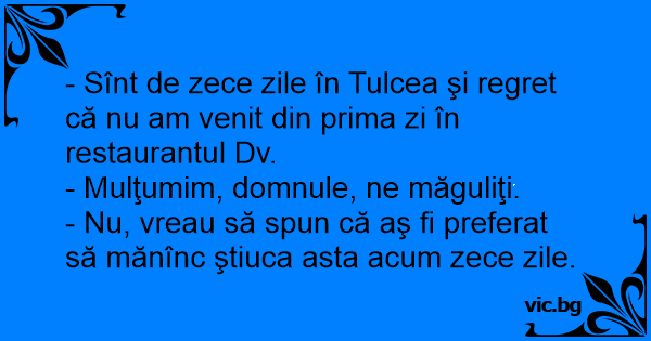 - Sînt de zece zile în Tulcea şi regret că nu am venit din prima zi în restaurantul Dv.