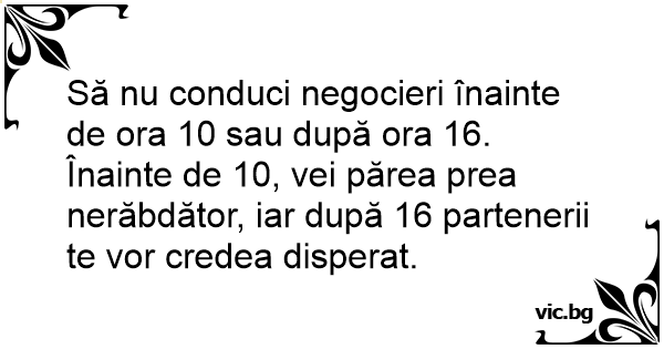 Să nu conduci negocieri înainte de ora 10 sau după ora 16. Înainte de 10, vei părea prea nerăbdător, iar după 16 partenerii te vor credea disperat.