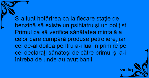 S-a luat hotărîrea ca la fiecare staţie de benzină să existe un psihiatru şi un poliţist. Primul ca să verifice sănătatea mintală a celor care cumpără produse petroliere, iar cel de-al doilea pentru a-i lua în primire pe cei declaraţi sănătoşi de către primul şi a-i întreba de unde au avut banii.