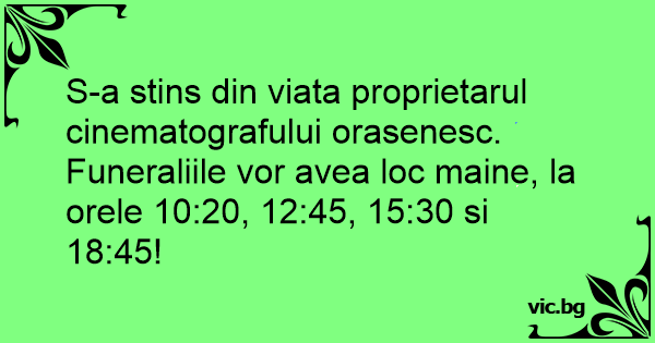 S-a stins din viata proprietarul cinematografului orasenesc. Funeraliile vor avea loc maine, la orele 10:20, 12:45, 15:30 si 18:45!