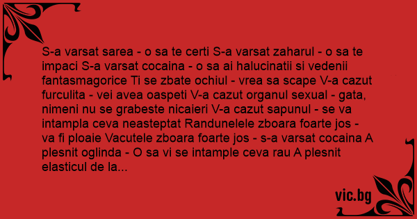 S-a varsat sarea - o sa te certi S-a varsat zaharul - o sa te impaci S-a varsat cocaina - o sa ai halucinatii si vedenii fantasmagorice Ti se zbate ochiul - vrea sa scape V-a cazut furculita - vei avea oaspeti V-a cazut organul sеxuаl - gata, nimeni nu se grabeste nicaieri V-a cazut sapunul - se va intampla ceva neasteptat Randunelele zboara foarte jos - va fi ploaie Vacutele zboara foarte jos - s-a varsat cocaina A plesnit oglinda - O sa vi se intample ceva rau A plesnit elasticul de la chiloti - o sa vi se intample o rusine mare sau o rusine mica A plesnit prezervativul - mai bine plesnea oglinda A trecut pisica neagra prin fata - asteptati sa va plesneasca prezervativul, dorindu-va ca mai bine sa fi plesnit oglinda A cazut o stea - pana si stelele se impiedica, puneti o dorinta Va mananca palma stanga - o sa primiti bani si o sa va manance nasul Va mananca palma dreapta - vedeti un dermatolog, aveti raie Va mananca nasul - veti da chef, daca v-a mancat palma stanga Va mananca fundul - o sa vi se intample o aventura Va mananca organul sеxuаl - veti cauta doctorul Nu vi s-a deschis parasuta - v-a mancat in fund, mai ales ca v-a crapat si oglinda Va intalniti cu cosarul - ati baut la crasma pana la trei dimineata