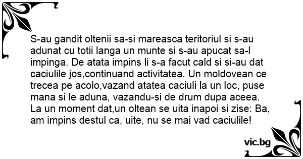 S-au gandit oltenii sa-si mareasca teritoriul si s-au adunat cu totii langa un munte si s-au apucat sa-l impinga. De atata impins li s-a facut cald si si-au dat caciulile jos,continuand activitatea. Un moldovean ce trecea pe acolo,vazand atatea caciuli la un loc, puse mana si le aduna, vazandu-si de drum dupa aceea. La un moment dat,un oltean se uita inapoi si zise: Ba, am impins destul ca, uite, nu se mai vad caciulile!