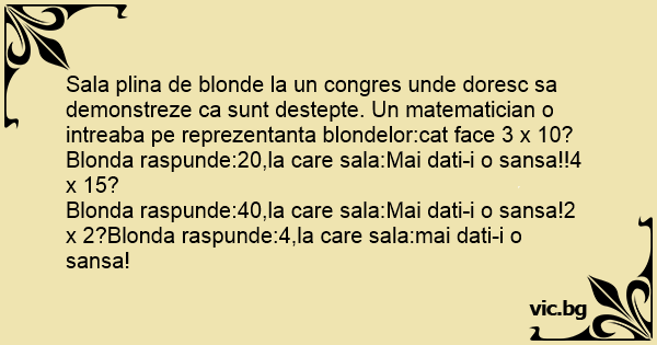 Sala plina de blonde la un congres unde doresc sa demonstreze ca sunt destepte. Un matematician o intreaba pe reprezentanta blondelor:cat face 3 x 10?Blonda raspunde:20,la care sala:Mai dati-i o sansa!!4 x 15?